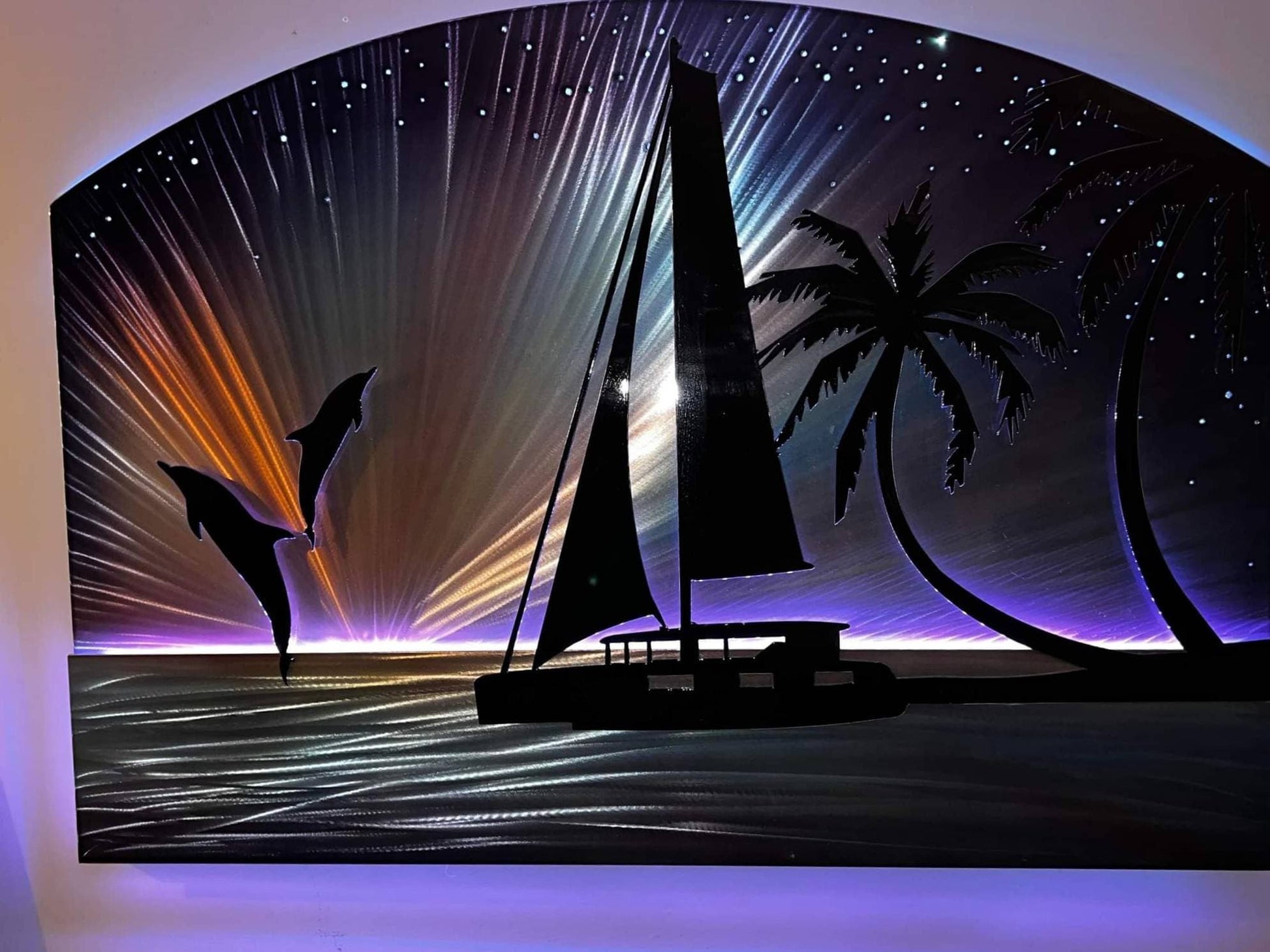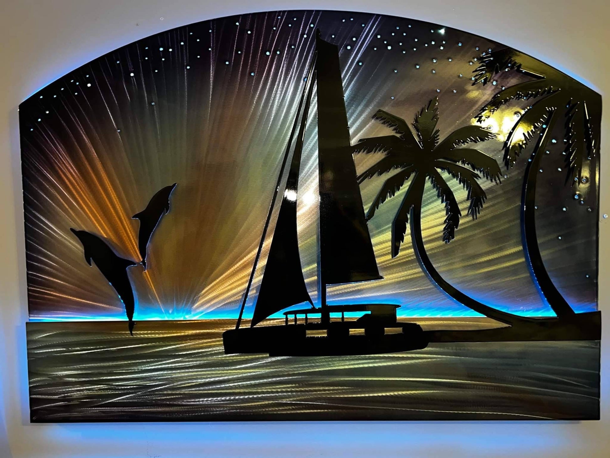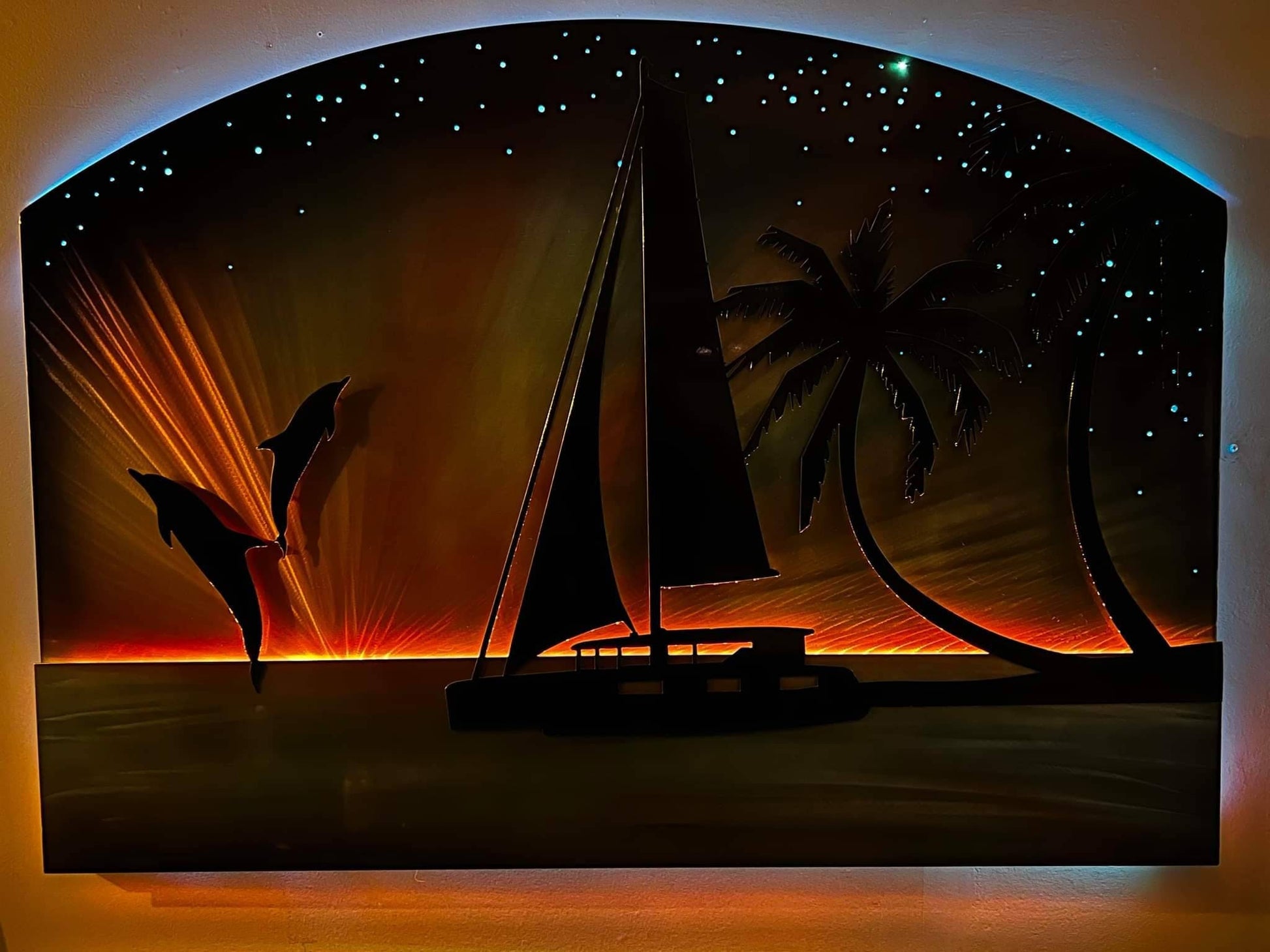 Looking for something specific that you don't see listed? Have a unique idea for a custom metal wall art design? Sean Tuttle specializes in bringing your vision to life. For example, imagine a lighted panel capturing your favorite spot in the Bahamas at sunset on a sailboat. Sean's attention to detail and craftsmanship exceeded expectations, leaving clients thrilled with the result. If you have a custom design idea or don't see what you're looking for in our shop, reach out to us. Sean will collaborate with you to turn your ideas into reality. Pricing for custom designs varies based on the complexity and size of the project.