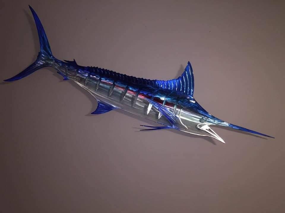 Introducing Sean Tuttle's limited edition Exo Stencil-ism Series Striped Blue Marlin. These premium 3D sculptures redefine artistic quality, featuring a lifelike portrayal of a Striped Blue Marlin. An innovative design combines a stencil cutout of the fish's distinguished features with a reverse concave silhouette, creating a mesmerizing holographic effect. The Striped Blue Marlin is a true showcase of Sean's craftsmanship and design talents, complete with free LED lights, batteries, charger, and remote control.