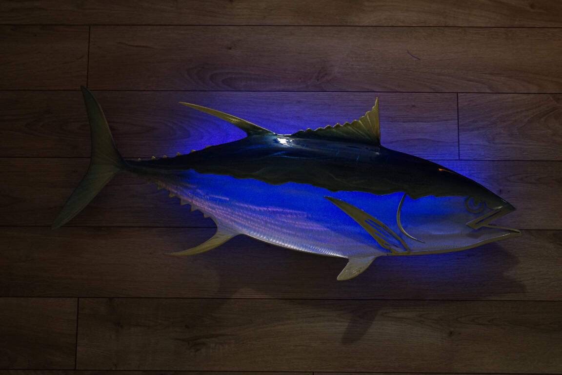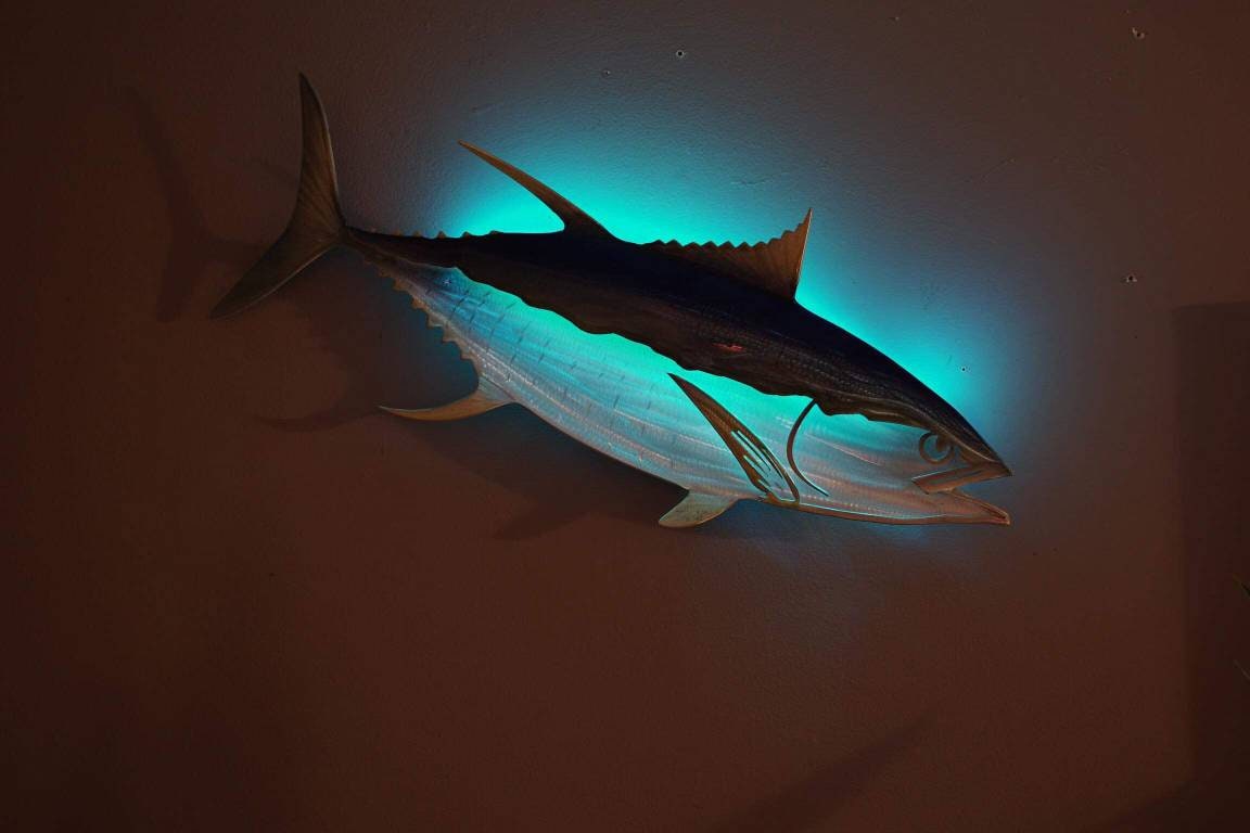 Introducing Sean Tuttle's limited edition Exo Stencil-ism Series Tuna. These premium 3D sculptures redefine artistic quality, featuring a lifelike portrayal of a Tuna fish. An innovative design combines a stencil cutout of the fish's distinguished features with a reverse concave silhouette, creating a mesmerizing holographic effect. The Tuna is a true showcase of Sean's craftsmanship and design talents, available in 32, 42, or 48 inches. Each sculpture comes with free LED lights, remote control, 4 double A batteries, and a battery charger, ensuring a complete experience for enthusiasts.