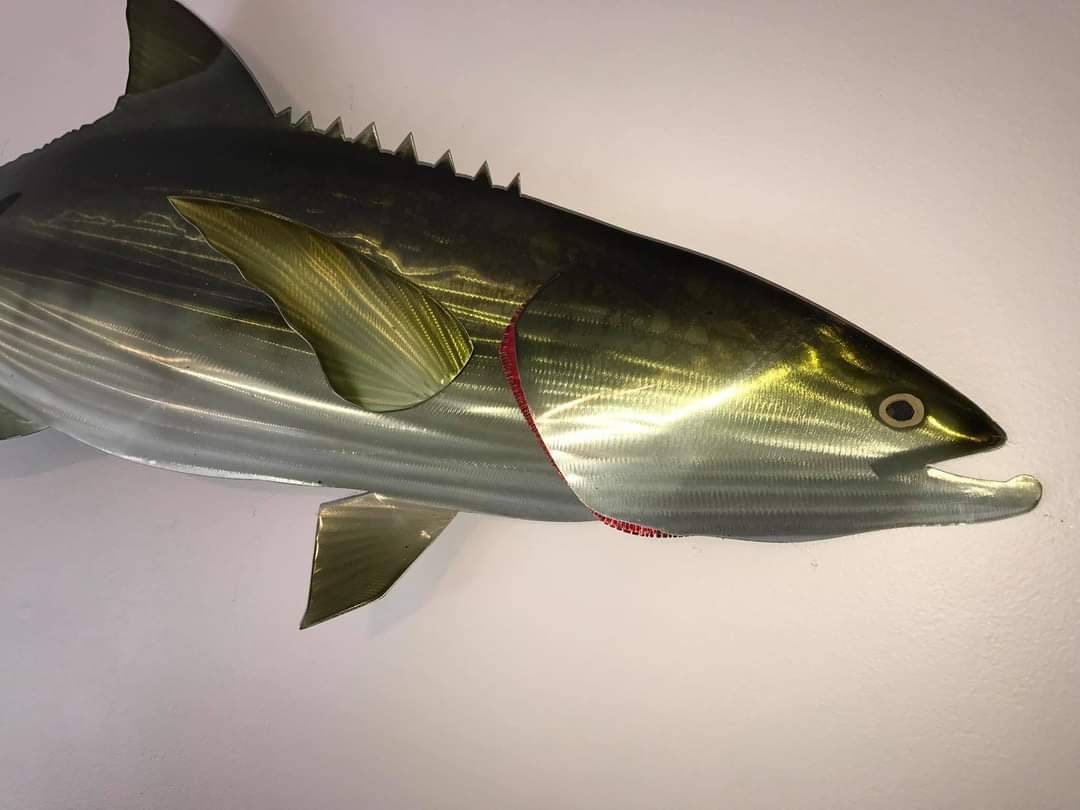 Discover Sean Tuttle's exquisite Cobia sculpture, a masterpiece of handcrafted metal art. Meticulously molded, etched, and painted with precision, the metal's curvature adds remarkable detail and depth to this stunning piece. Featuring lifelike gills and a mounted pectoral fin, this 'Kingfish' sculpture is an ideal and incredibly realistic gift for fishermen and enthusiasts of ocean-inspired decor.