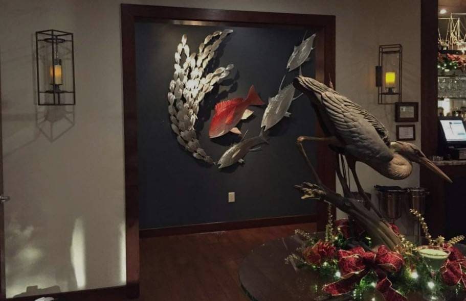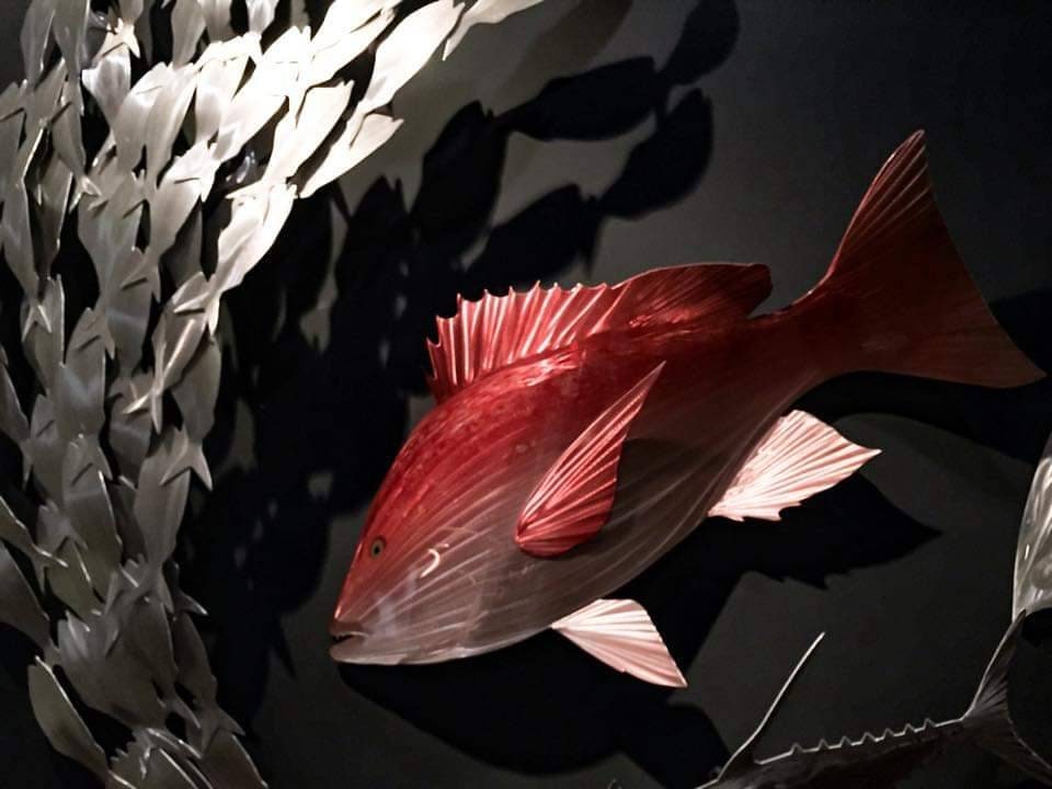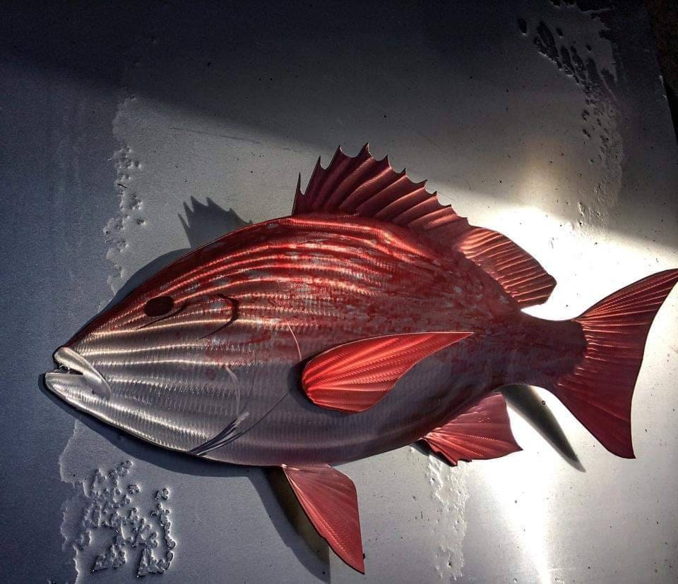 Introducing the Red Snapper: A Custom Metal Fish Sculpture by Sean Tuttle. With its vibrant reddish-orange coloration and exquisite handmade details, this stunning piece is a perfect addition to elevate any home or business décor with a touch of marine elegance.