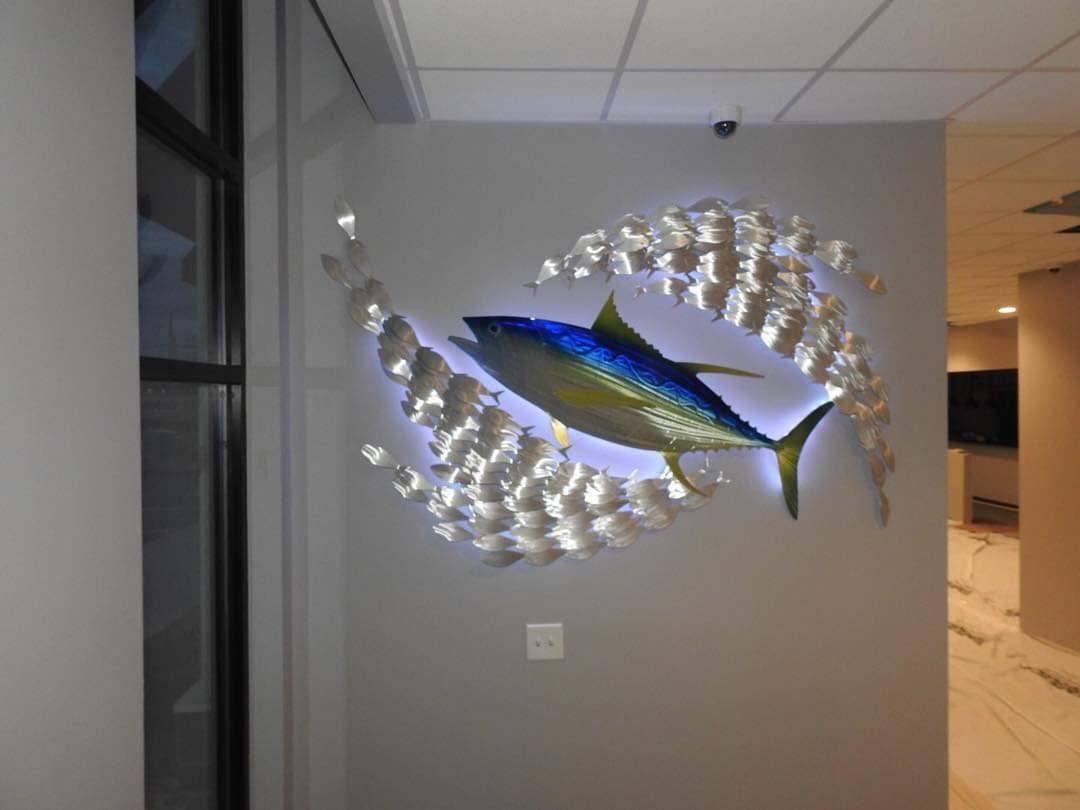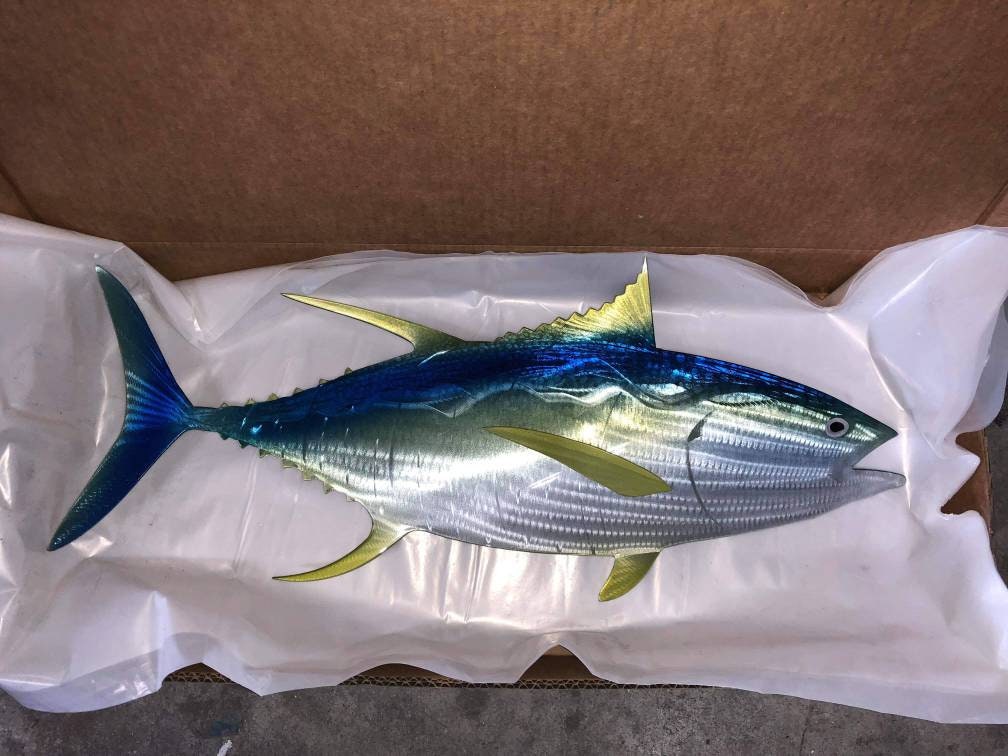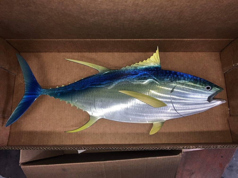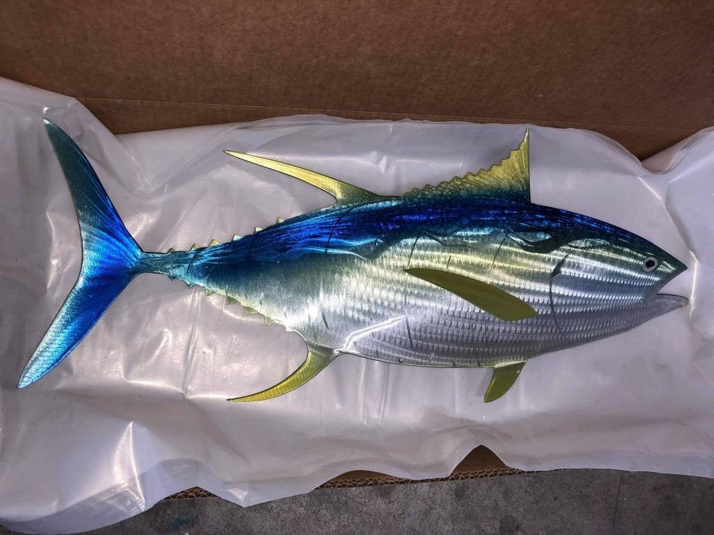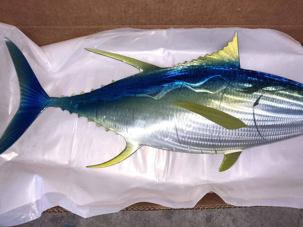 Sean Tuttle's Yellow Fin Tuna: Original Handmade Metal Wall Art, Lifelike Sculpture of a Predatory Game Fish with Detailed Etchings