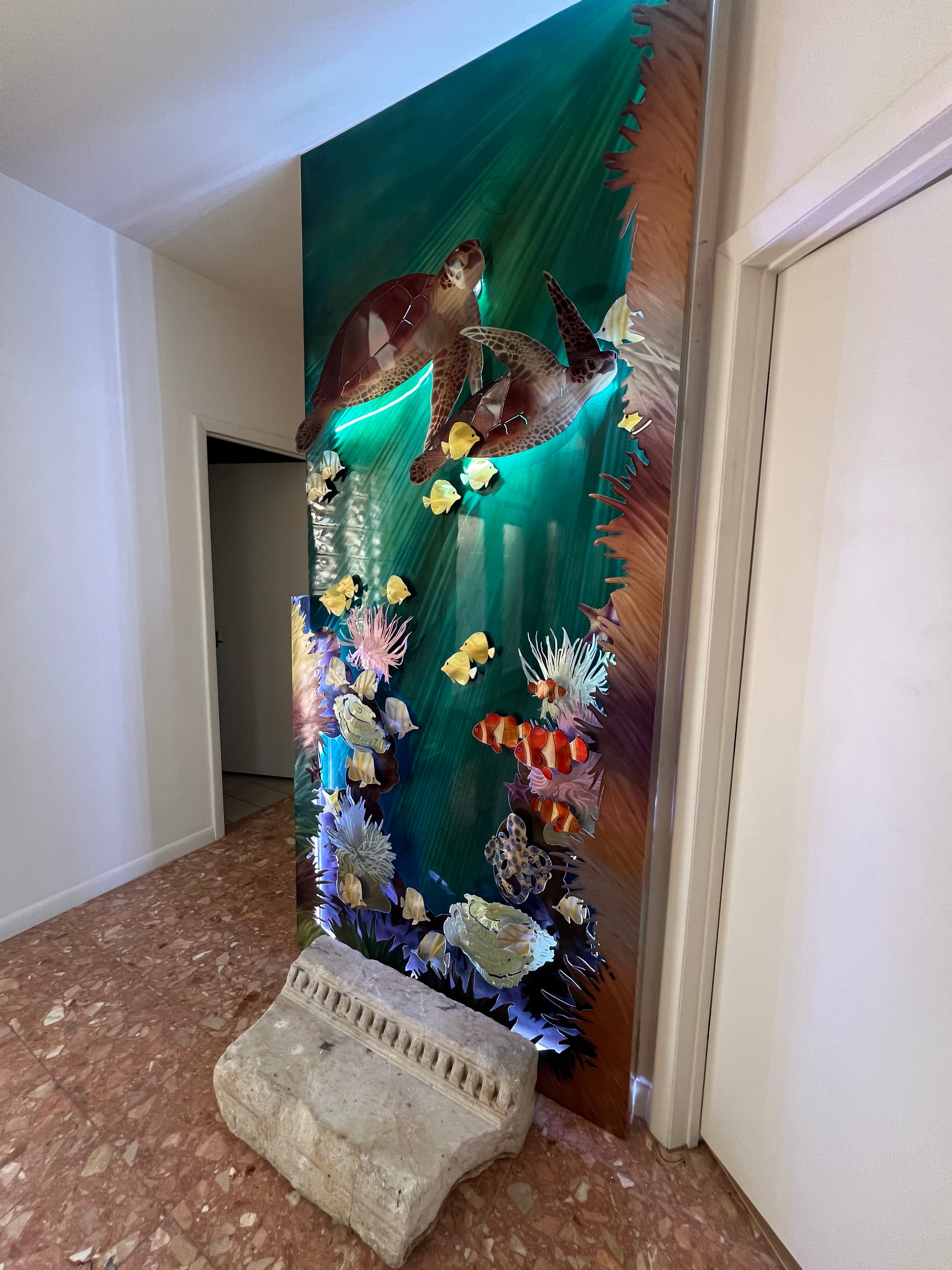 Sean Tuttle’s Tortuga Reef Tank Wall Panel is a captivating illuminated sculpture that brings the magic of the ocean to your interior space. Handcrafted with meticulous detail, it features two sea turtles gliding through a vibrant reef tank teeming with colorful corals, anemones, clownfish, yellow tangs, copper banded butterflies—and a rare, striking blue-ringed octopus nestled among the reef.