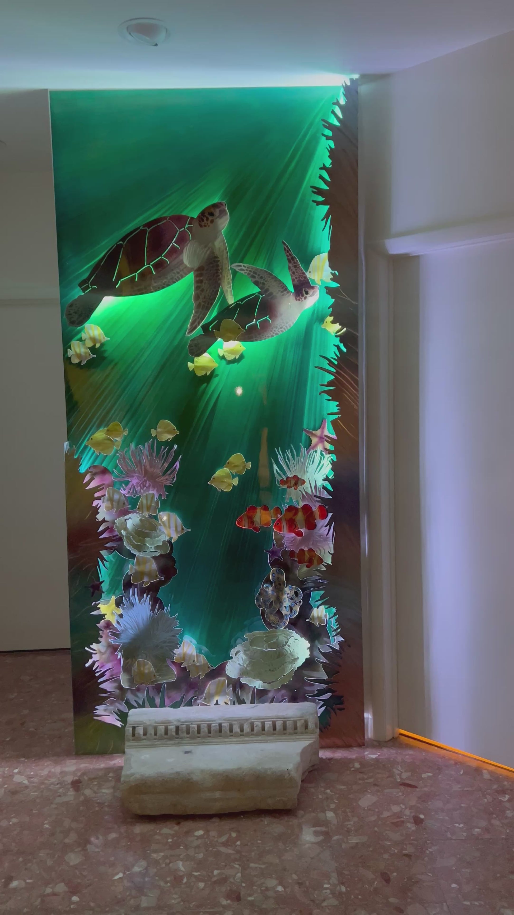 Measuring 48” wide x 110” tall x 4” deep, this sleek, lighted wall art makes an unforgettable statement in luxury homes, restaurants, spas, boutique hotels, or galleries. A favorite among interior designers and collectors, it’s the perfect fusion of sculpture, reef tank-inspired art, and immersive décor.
