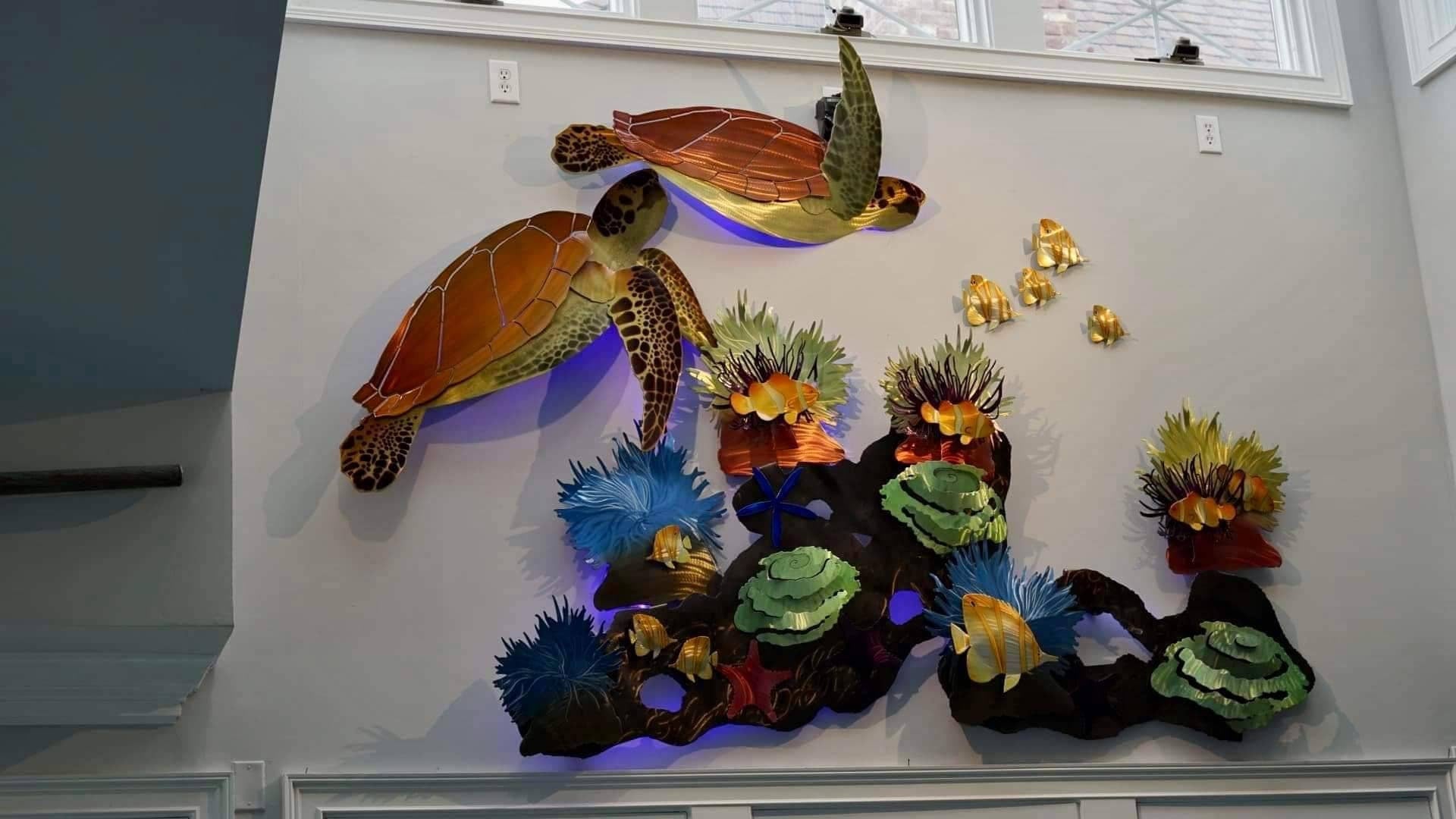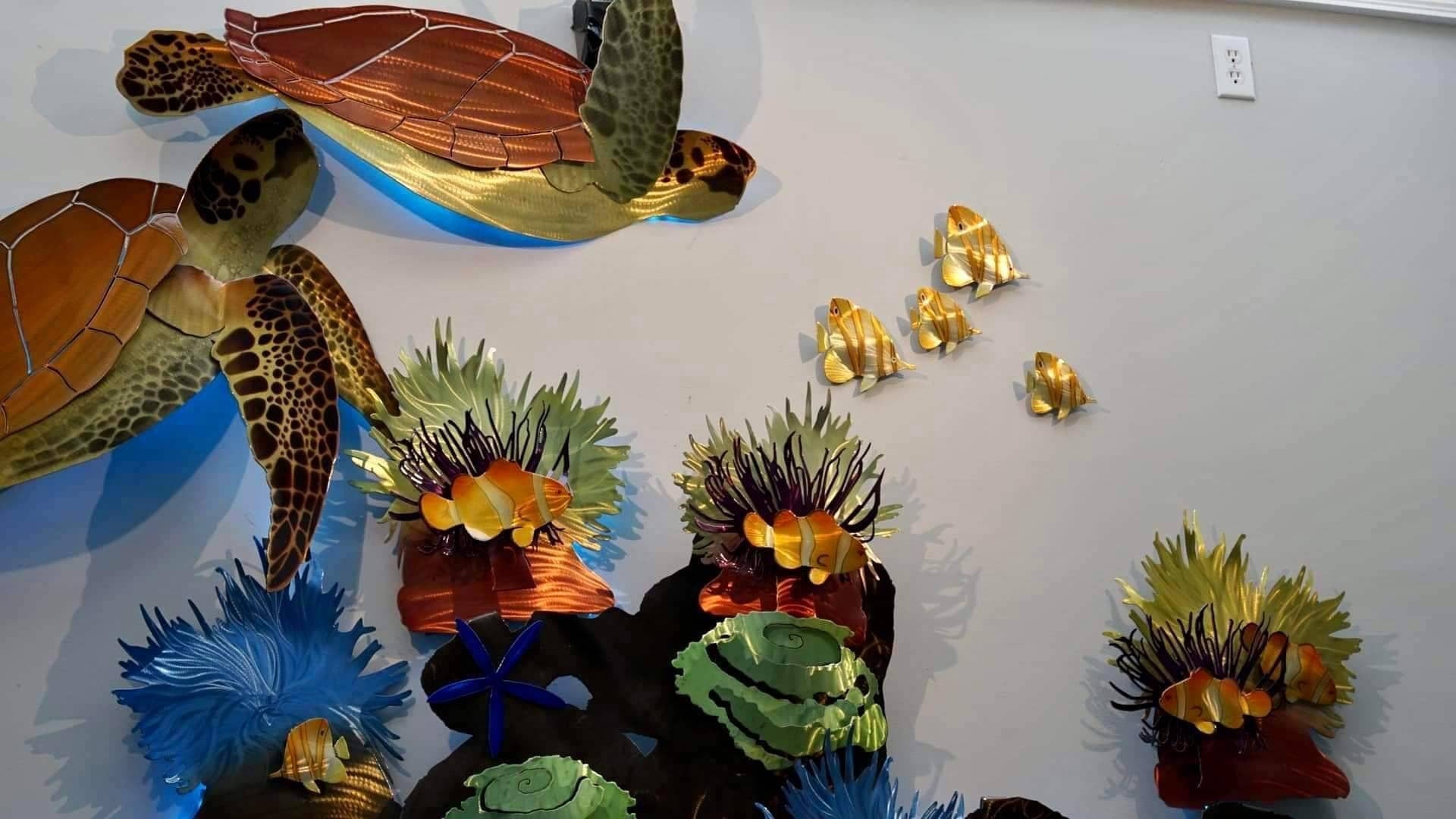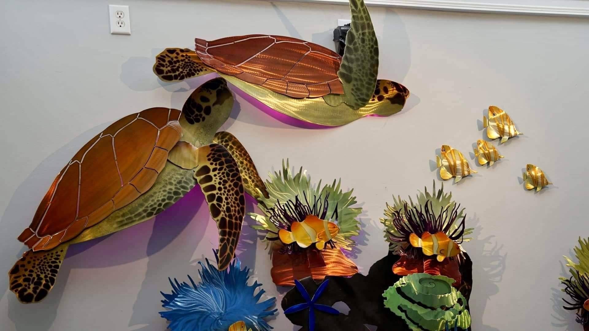 Tortuga Reef: Vibrant Sea Turtle Sculptures Amidst a Coral Wonderland - Metal Wall Art