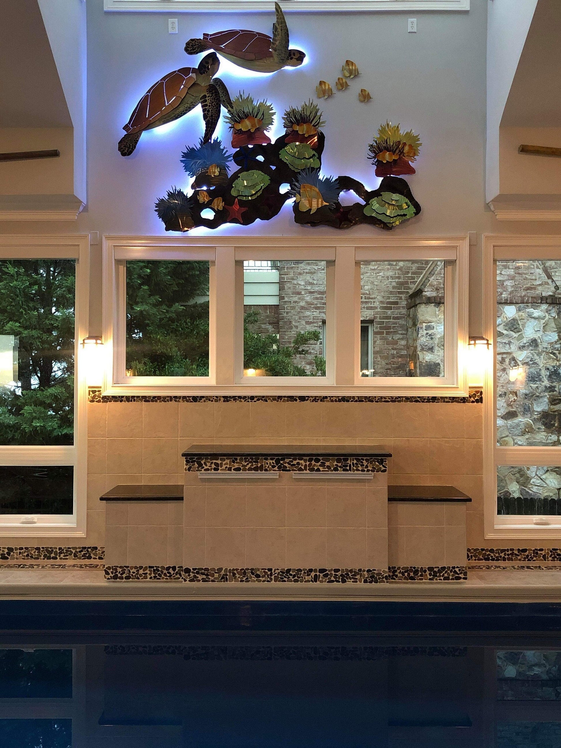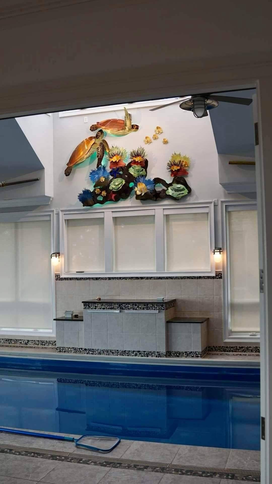 The ambient light dances through the vivid colors of the reef, creating a captivating display that draws the eye and sparks the imagination. With dimensions of approximately 10 feet by 8 feet, this immersive piece transforms your wall into an aquatic wonderland.