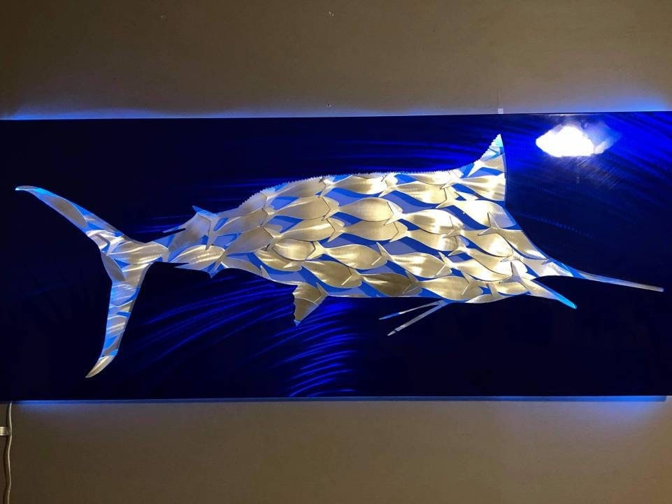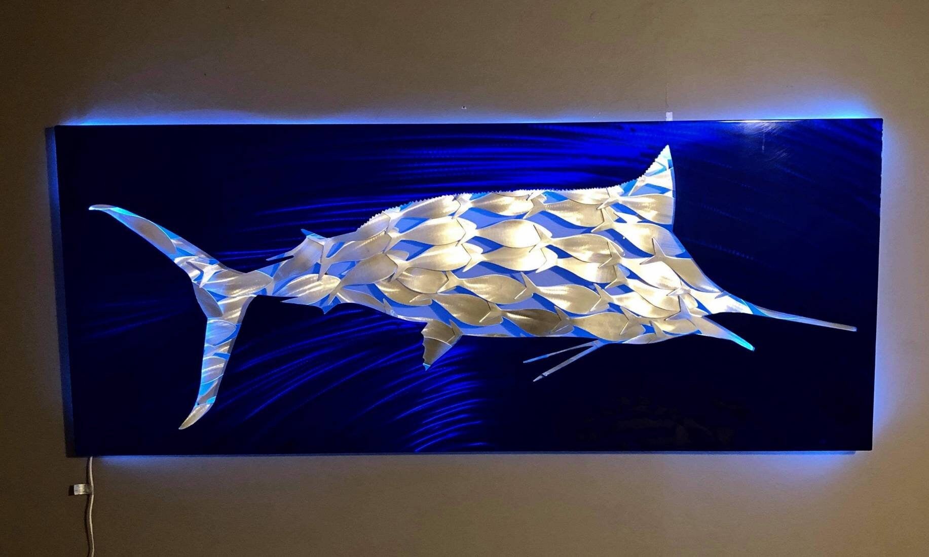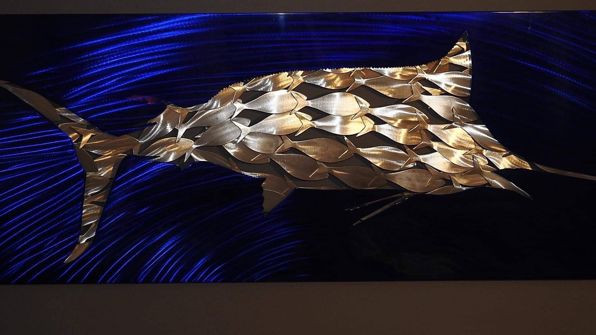 Embrace the Ocean's Essence with 'You Are What You Eat,' a captivating handmade metal panel sculpture depicting a majestic 48” straight blue marlin surrounded by a vibrant stream of baitfish. This artwork showcases a meticulously etched front panel, elegantly painted in aquatic blue hues. Each baitfish is meticulously molded, etched, and ground to form a mesmerizing pattern, adding depth and allure to the piece. Perfectly suited for any ocean-inspired setting, be it a home or business, this sculpture is sure to captivate admirers and elevate the ambiance with its aquatic charm.